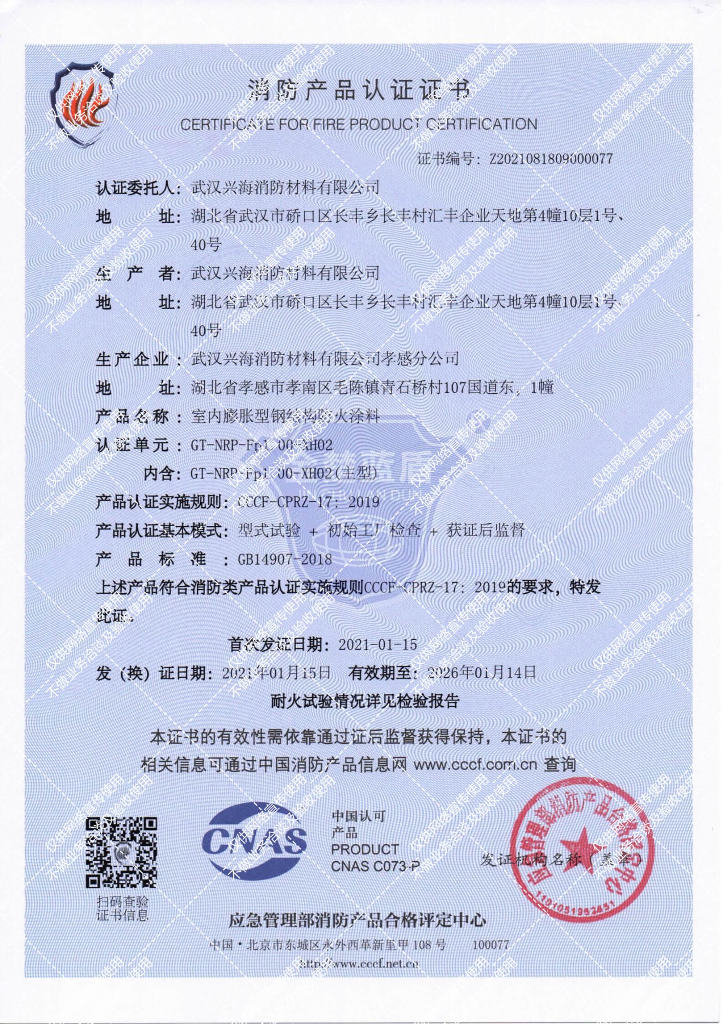 室內(nèi)膨脹型1小時(shí)鋼結(jié)構(gòu)防火涂料證書(shū)