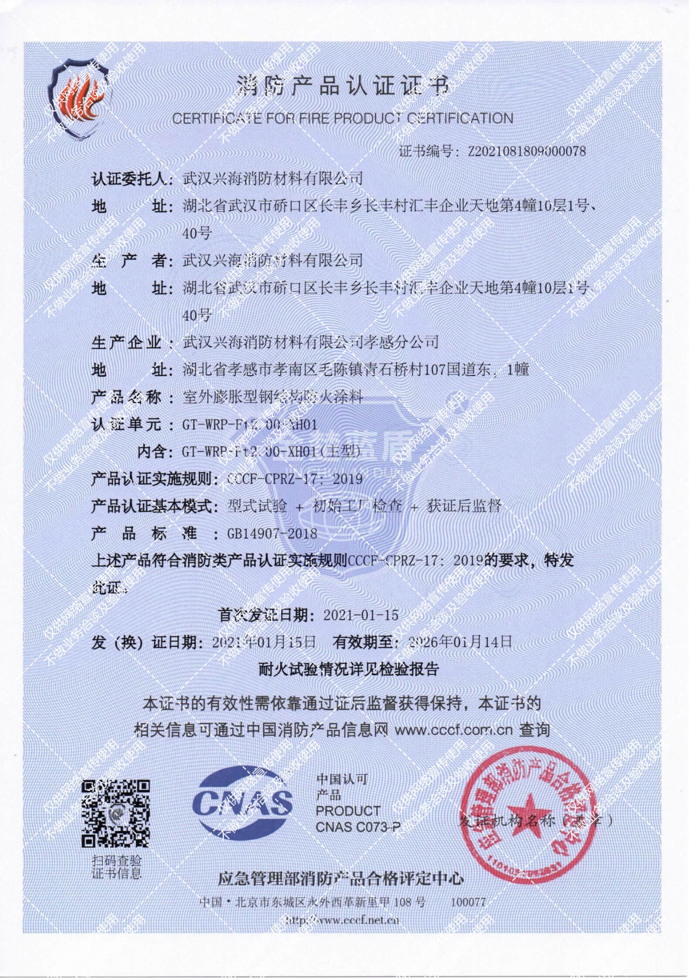 室外膨脹型(特種)鋼結構防火涂料消防產(chǎn)品認證證書