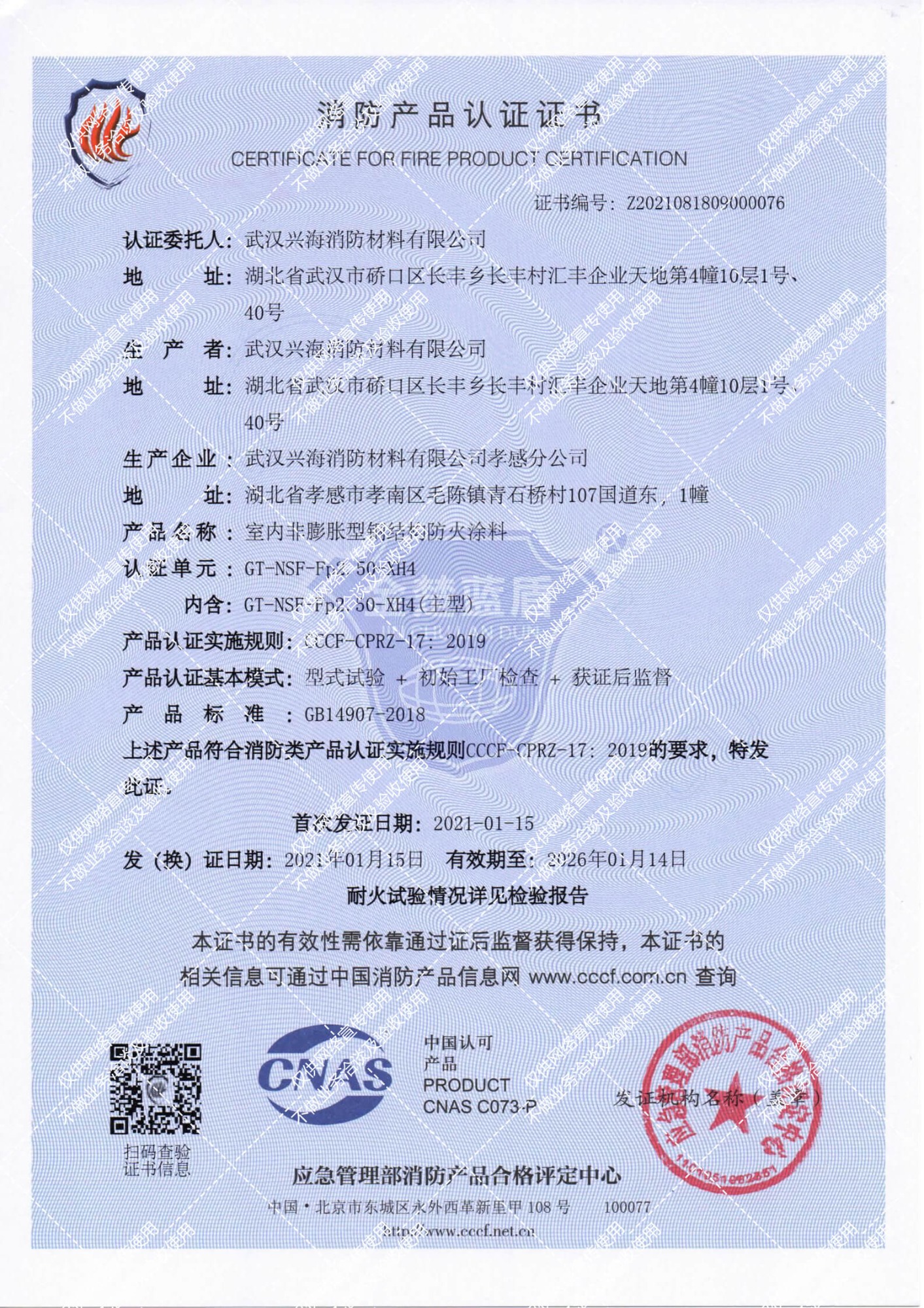: 室內(nèi)膨脹型1小時(shí)鋼結(jié)構(gòu)防火涂料證書